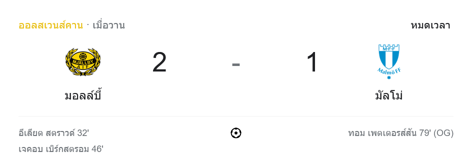 ผลบอลออลสเวนส์คาน 2024 มอลล์บี้ เอไอเอฟ 2-1 มัลโม่ เอฟเอฟ 14/7/67