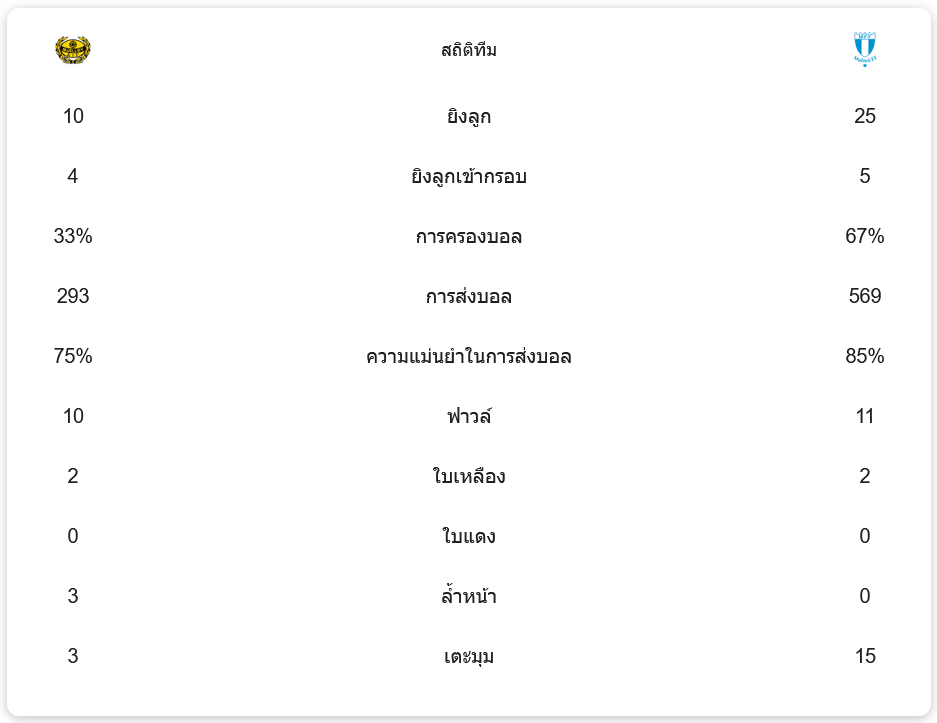 มอลล์บี้ เอไอเอฟ ครองบอลเพียง 33% ยิงประตูทั้งหมด 10 ครั้ง โดยเข้ากรอบ 4 ครั้ง พวกเขาส่งบอลทั้งหมด 293 ครั้ง ด้วยความแม่นยำในการส่งบอลอยู่ที่ 75% มอลล์บี้ เอไอเอฟ ทำฟาวล์ทั้งหมด 10 ครั้ง ได้รับใบเหลือง 2 ใบ ไม่มีใบแดง ลูกล้ำหน้า 3 ครั้ง และได้ลูกเตะมุม 3 ครั้ง