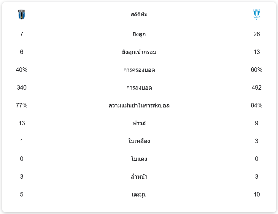 ในเกมนี้ ซิริอุสมีการยิงลูกทั้งหมด 7 ครั้ง โดย 6 ครั้งตรงกรอบ ขณะที่มัลโม่ยิงลูกทั้งหมด 26 ครั้ง ตรงกรอบ 13 ครั้ง มัลโม่มีการครองบอลถึง 60% และการส่งบอลทั้งหมด 492 ครั้ง ซึ่งมีความแม่นยำในการส่งบอลถึง 84% ขณะที่ซิริอุสครองบอล 40% มีการส่งบอลทั้งหมด 340 ครั้ง และความแม่นยำในการส่งบอลอยู่ที่ 77%