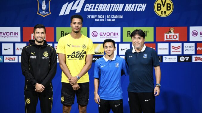 เมื่อช่วงบ่ายของวันนี้ ที่ชั้น 34 อาคารสิงห์ คอมเพล็กซ์ ได้มีการจัดแถลงข่าวเกมฟุตบอลนัดพิเศษ 114 Celebration BG Pathum United x BVB Dortmund โดยจะเป็นการเจอกันของ บีจี ปทุม ยูไนเต็ด กับ ดอร์ทมุนด์ ซึ่งการแถลงข่าวครั้งนี้ ทาง บีจี ส่ง มาโกโตะ เทกุระโมริ เฮดโค้ชชาวญี่ปุ่น และ ชนาธิป สรงกระสินธ์ เข้างาน ด้าน ดอร์ทมุนด์ ส่ง นูริ ซาฮิน กุนซือใหญ่ กับ เฟลิกซ์ เอ็นเมชา มาร่วมงาน