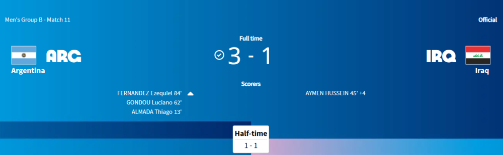 ช่วงท้ายเกมนาทีที่ 85 ฮูเลี่ยน อัลวาเรซ จัดแอสซิสต์ที่สองของตัวเอง คราวนี้เป็นการแตะบอลสั้นๆ คืนหลังให้ เอเซเกล เฟร์นานเดซ ยิงด้วยซ้ายจากหน้าเขตโทษ บอลพุ่งเสียบตาข่ายอย่างสวยงาม และเป็นประตูปิดท้ายที่ทำให้ อาร์เจนตินา คว้าชัยชนะ 3-1 และคว้า 3 แต้มสำคัญก่อนเจอกับ ยูเครน ในนัดชี้ชะตาเข้ารอบ ส่วน อิรัก ยังคงมี 3 แต้มเช่นเดิม และต้องพบกับ โมร็อกโก ในวันอังคารที่ 29 ก.ค.นี้