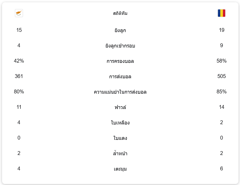 ในแมตช์นี้ โรมาเนียมีความเหนือกว่าชัดเจน โดยครองบอลได้ถึง 58% และยิงเข้ากรอบได้ 9 ครั้ง จากทั้งหมด 19 ครั้ง ขณะที่ไซปรัสมีการครองบอลเพียง 42% และยิงเข้ากรอบได้แค่ 4 ครั้งจาก 15 ครั้ง ความแม่นยำในการส่งบอลของโรมาเนียอยู่ที่ 85% จากการส่งบอลทั้งหมด 505 ครั้ง แสดงถึงความเป็นทีมที่มีการเล่นที่มีประสิทธิภาพและทำเกมรุกได้ดี