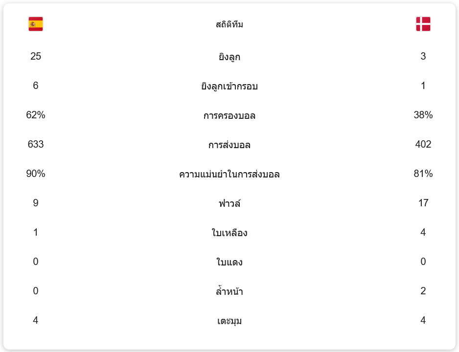แม้ว่าผลสกอร์จะใกล้เคียง แต่สเปนกลับมีความได้เปรียบชัดเจนในเรื่องการครองบอลที่มากถึง 62% พร้อมกับการส่งบอลทั้งหมด 633 ครั้ง ความแม่นยำในการส่งบอลของสเปนก็สูงถึง 90% ขณะที่เดนมาร์กครองบอลเพียง 38% และมีโอกาสยิงเข้ากรอบเพียง 1 ครั้งจากทั้งหมด 3 ครั้ง เกมนี้เต็มไปด้วยการปะทะ โดยเดนมาร์กทำฟาวล์ไปถึง 17 ครั้ง และได้รับใบเหลืองถึง 4 ใบ