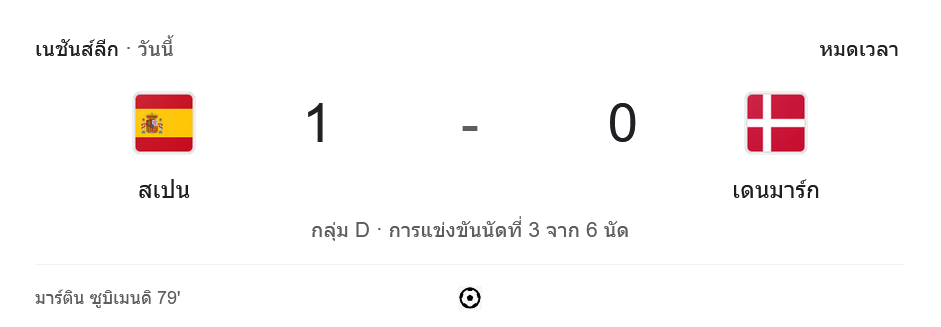 การแข่งขัน ยูฟ่าเนชันส์ลีก 2024 กลุ่ม D นัดที่ 3 เป็นการพบกันระหว่างทีมชาติ สเปน เปิดบ้านรับมือทีมชาติ เดนมาร์ก โดยผลการแข่งขันในครั้งนี้ สเปนสามารถคว้าชัยไปได้ 1-0 จากการทำประตูในช่วงท้ายเกม ส่งผลให้สเปนเก็บสามแต้มสำคัญ พร้อมยึดตำแหน่งจ่าฝูงของกลุ่มได้อย่างสมศักดิ์ศรี