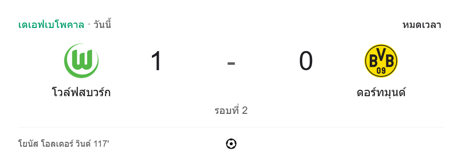 การแข่งขัน เดเอฟเบ-โพคาล 2024 รอบที่ 2 ระหว่าง โวล์ฟสบวร์ก และ โบรุสเซีย ดอร์ทมุนด์ จบลงด้วยชัยชนะของโวล์ฟสบวร์กในช่วงต่อเวลาพิเศษ 1-0 จากการยิงประตูของ โยนาส โอลเดอร์ วินด์ ในนาทีที่ 117 ทำให้โวล์ฟสบวร์กสามารถผ่านเข้ารอบต่อไปได้อย่างตื่นเต้น บ้านกีฬา พร้อมสรุปทุกจังหวะสำคัญในเกมนี้เพื่อแฟนบอลทุกท่าน