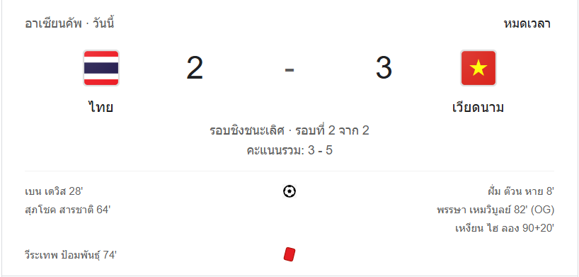 จบเกม: เวียดนามเอาชนะไทย 3-2 รวมผลสองนัด เวียดนามชนะ 5-3