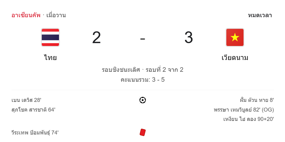 ศึกอาเซียนฟุตบอลแชมเปียนชิพ 2024 ระหว่างทีมชาติไทยและทีมชาติเวียดนามในรอบชิงชนะเลิศนัดที่ 2 เป็นแมตช์ที่เต็มไปด้วยความเข้มข้น และการแสดงศักยภาพที่ยอดเยี่ยมของทั้งสองทีม แม้ทีมชาติไทยจะพยายามอย่างหนัก แต่สุดท้ายก็ไม่อาจหยุดยั้งเวียดนามที่มาเยือนพร้อมฟอร์มการเล่นอันเฉียบคม ผลการแข่งขันจบลงด้วยสกอร์ 3-2 รวมสองนัด เวียดนามชนะไป 5-3