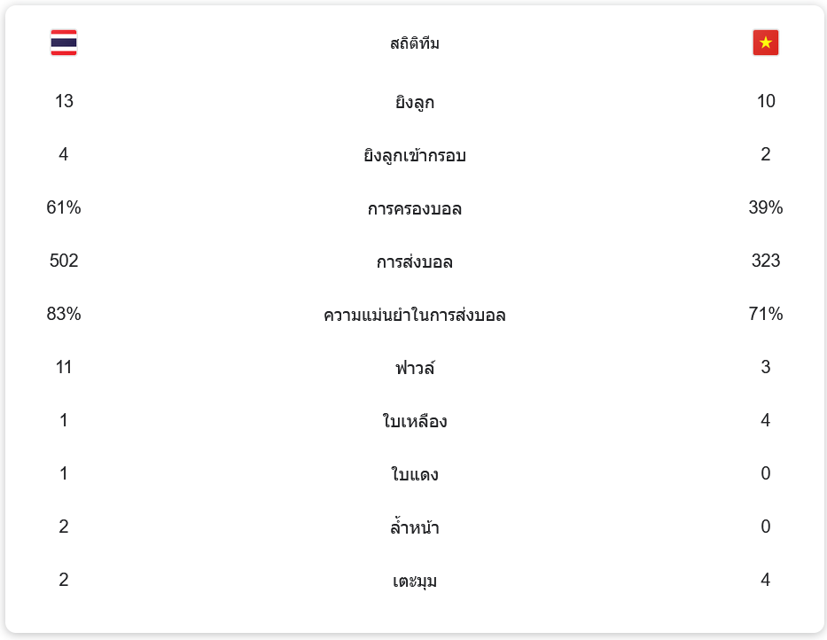 ทีมชาติไทยยิงทั้งหมด 13 ครั้ง เข้ากรอบ 4 ครั้ง และครองบอลถึง 61% ขณะที่เวียดนามยิงทั้งหมด 10 ครั้ง เข้ากรอบ 2 ครั้ง แต่เปลี่ยนเป็นประตูได้ถึง 3 ลูก ทั้งสองทีมทำฟาวล์รวมกัน 14 ครั้ง โดยไทยมีใบแดง 1 ใบ และใบเหลือง 1 ใบ