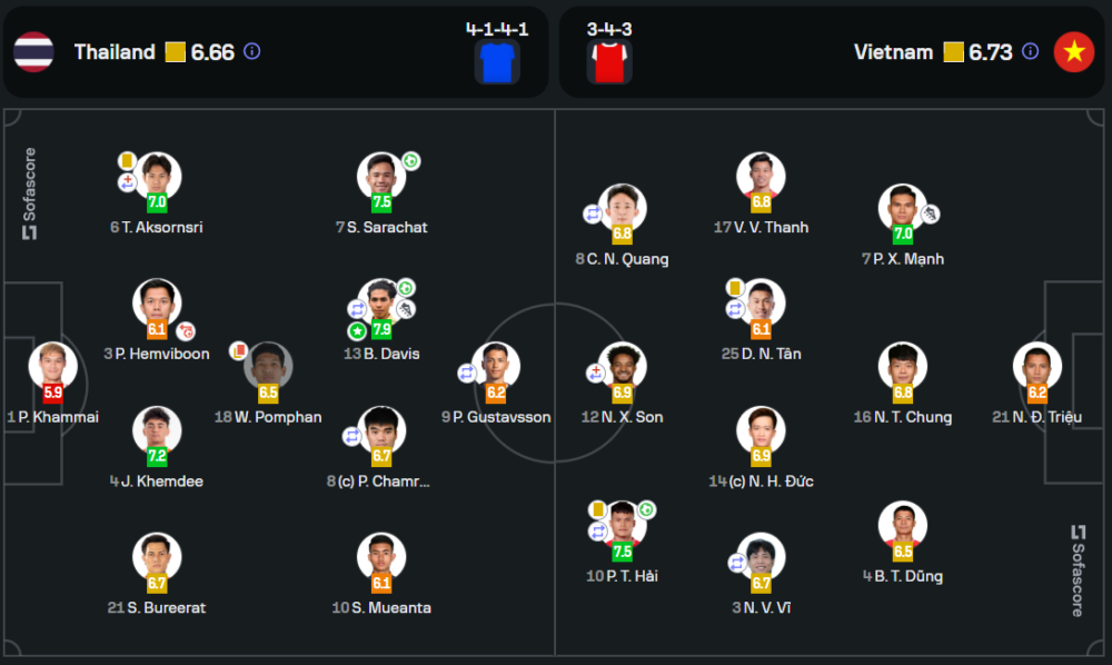 ไทยมาในระบบ 4-3-3 โดยเน้นการครองบอลและการจ่ายสั้นเพื่อเจาะพื้นที่ว่างในแดนของเวียดนาม ขณะที่เวียดนามใช้ระบบ 3-4-3 เน้นการตั้งรับลึกและสวนกลับเร็ว การเปรียบเทียบพบว่า ไทยมีความแม่นยำในการจ่ายบอลสูงถึง 83% และครองบอลได้มากกว่า (61%) แต่เวียดนามมีการตั้งรับที่เหนียวแน่นและใช้จังหวะโต้กลับสร้างความเสียหายได้อย่างมีประสิทธิภาพ