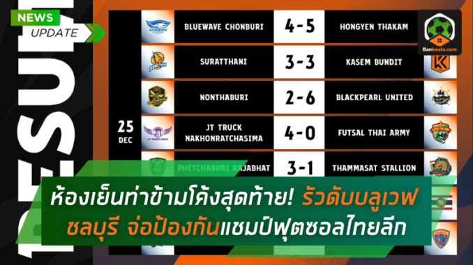 ศึก MEA ฟุตซอลไทยลีก 2024 แมตช์เดย์ 25 นัดรองสุดท้ายของฤดูกาล เมื่อวันพุธที่ 25 ธันวาคม 2567 กลายเป็นดราม่าสะเทือนวงการในเกมซูเปอร์บิ๊กแมตช์ระหว่าง ห้องเย็นท่าข้าม ทีมจ่าฝูง ที่บุกมาคว้าชัยเหนือเจ้าบ้าน บลูเวฟ ชลบุรี 5-4 ด้วยลูกยิงนาทีบาปที่ส่งให้ห้องเย็นท่าข้ามจ่อป้องกันแชมป์ลีกได้เป็นสมัยที่ 2