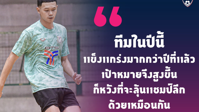 ตัวรับวัย 25 ปี ได้กล่าวถึงความพร้อมของทีมว่า “ความพร้อมของทีมตอนนี้มีเกิน 90% แล้วครับ นักเตะที่ย้ายเข้ามาใหม่ก็ปรับตัวกับทีมได้ดี ซึ่งทีมในปีนี้มีความแข็งแกร่งมากกว่าฤดูกาลที่แล้ว ดังนั้นเป้าหมายของเราจึงสูงขึ้น และหวังที่จะลุ้นแชมป์ฟุตซอลไทยลีกด้วยเหมือนกัน”