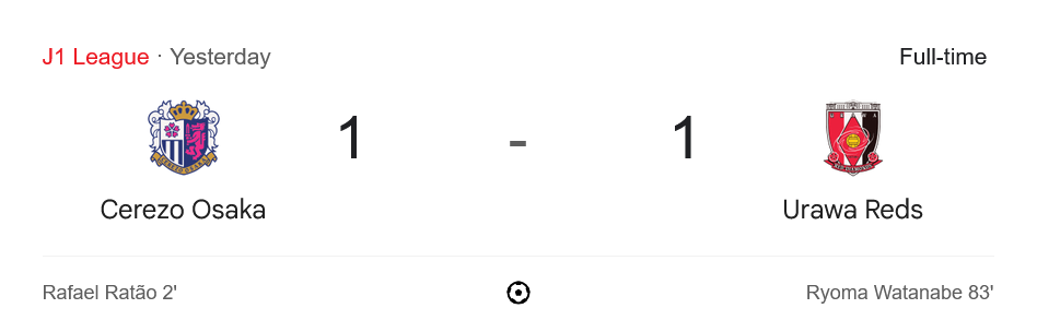 ศึก เจลีก ดิวิชัน 1 2025 ระหว่าง เซเรโซ โอซาก้า พบกับ อูราวะ เรด ไดมอนส์ สิ้นสุดลงด้วยผล เสมอ 1-1 ที่สนามบ้านของเซเรโซ โอซาก้า ในเกมที่แฟนบอลต่างเฝ้ารอคอยอย่างตื่นเต้น ผลบอลสด ของคู่นี้ถือว่าเข้มข้นตั้งแต่นาทีแรกจนถึงวินาทีสุดท้าย