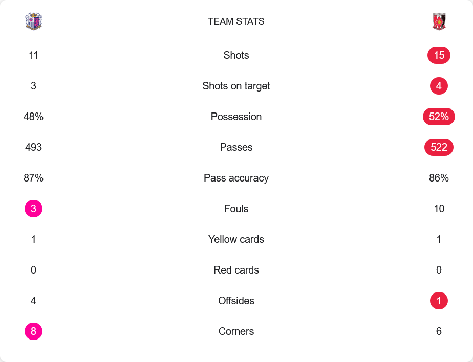 เกมนี้เต็มไปด้วยการบุกอย่างต่อเนื่องจากทั้งสองทีม โดย เซเรโซ โอซาก้า มีโอกาสยิงทั้งหมด 11 ครั้ง ยิงเข้ากรอบ 3 ครั้ง ครองบอล 48% ผ่านบอลสำเร็จ 493 ครั้ง ที่อัตราความแม่นยำ 87% ขณะที่ อูราวะ เรด ไดมอนส์ ยิงทั้งหมด 15 ครั้ง ยิงเข้ากรอบ 4 ครั้ง ครองบอล 52% ผ่านบอลสำเร็จ 522 ครั้ง ที่อัตราความแม่นยำ 86%