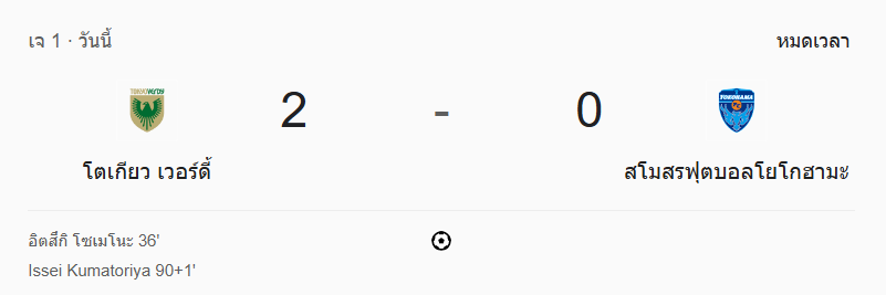 โตเกียว เวอร์ดี้ โชว์ฟอร์มในบ้านได้อย่างยอดเยี่ยม ทั้งในแง่ของเกมรุกที่เฉียบขาดและแนวรับที่เหนียวแน่น โดยเฉพาะผู้เล่นสำรองอย่าง Issei Kumatoriya ที่ลงมาซัดปิดเกมให้ทีมได้ในช่วงทดเจ็บ ส่วนฝั่ง โยโกฮามา เอฟซี แม้จะมีโอกาสหลายหน โดยเฉพาะลูกโหม่งจาก Fukumori และ Lara แต่ยังไม่เฉียบพอในการเปลี่ยนเป็นประตู เกมนี้สะท้อนให้เห็นถึงความแน่นอนของเวอร์ดี้ที่กำลังมั่นใจ และอาจกลายเป็นม้ามืดของฤดูกาลนี้