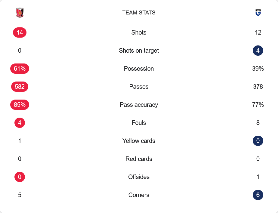 แม้อูราวะ เรด ไดมอนส์ จะครองบอลมากถึง 61% และจ่ายบอลได้ถึง 582 ครั้ง แต่ตลอดทั้งเกมพวกเขาไม่มีโอกาสยิงเข้ากรอบเลยแม้แต่ครั้งเดียวจากจำนวนทั้งหมด 14 ครั้ง ขณะที่กัมบะ โอซาก้า ครองบอล 39% มีจังหวะจ่ายบอล 378 ครั้ง และจบด้วยการยิงเข้ากรอบ 4 ครั้งจากทั้งหมด 12 ครั้ง พร้อมสร้างความแตกต่างด้วยประตูโทนของเกม ส่วนด้านวินัยเกม กัมบะทำฟาวล์มากกว่า (8 ต่อ 4) แต่ไม่มีใบเหลืองหรือแดงใด ๆ ขณะที่อูราวะโดน 1 ใบเหลืองจากโอกิวาระ