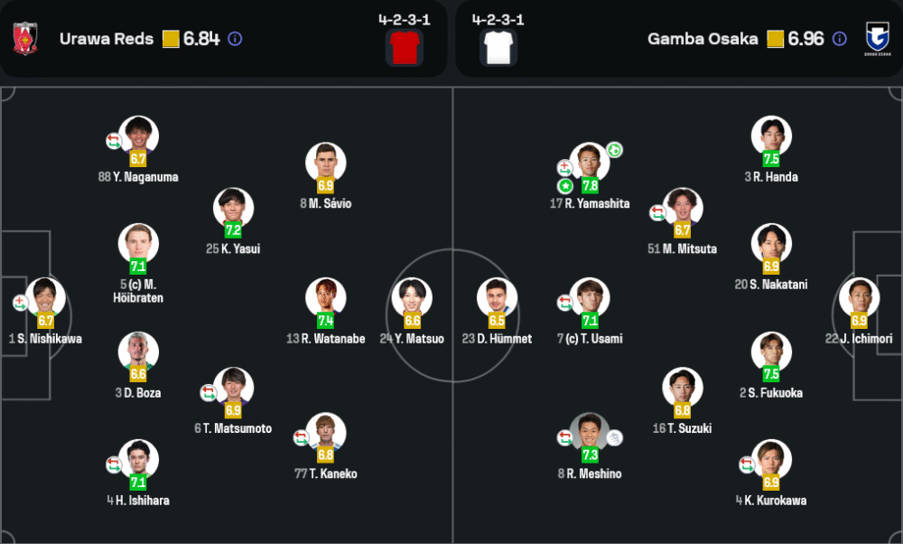 • กองกลาง: ทาคาชิ อูซามิ (7.1) → ฮารุมิ มินามิโนะ (6.4), มิตสึกิ มิตสึตะ (6.7) → ชู คูราตะ (6.7), เซยะ นาคาทานิ (6.9), เรียวตะ เมชิโนะ (7.3) → ทาเครุ คิชิโมโตะ (6.8)