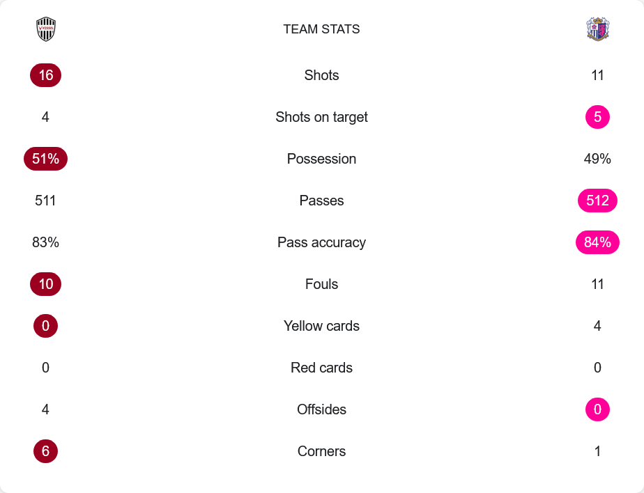 แม้เกมนี้จะดูสูสีในหลายด้าน โดยวิสเซล โกเบครองบอล 51% ส่วนเซเรโซ โอซาก้าอยู่ที่ 49% การจ่ายบอลก็ใกล้เคียงกันคือ 511 ต่อ 512 ครั้ง อย่างไรก็ตาม ฝั่งทีมเยือนมีความแม่นยำในการส่งบอลมากกว่าที่ 84% เทียบกับเจ้าถิ่นที่ 83% ส่วนการยิงประตู วิสเซล โกเบยิงมากถึง 16 ครั้ง เข้ากรอบ 4 ขณะที่เซเรโซ โอซาก้ายิง 11 ครั้ง เข้ากรอบ 5 ครั้ง ซึ่งกลายเป็น 3 ประตูแบบเด็ดขาด แม้โกเบจะได้เตะมุม 6 ครั้ง เซเรโซมีแค่ 1 แต่เกมสวนกลับทีมเยือนเฉียบขาดกว่า