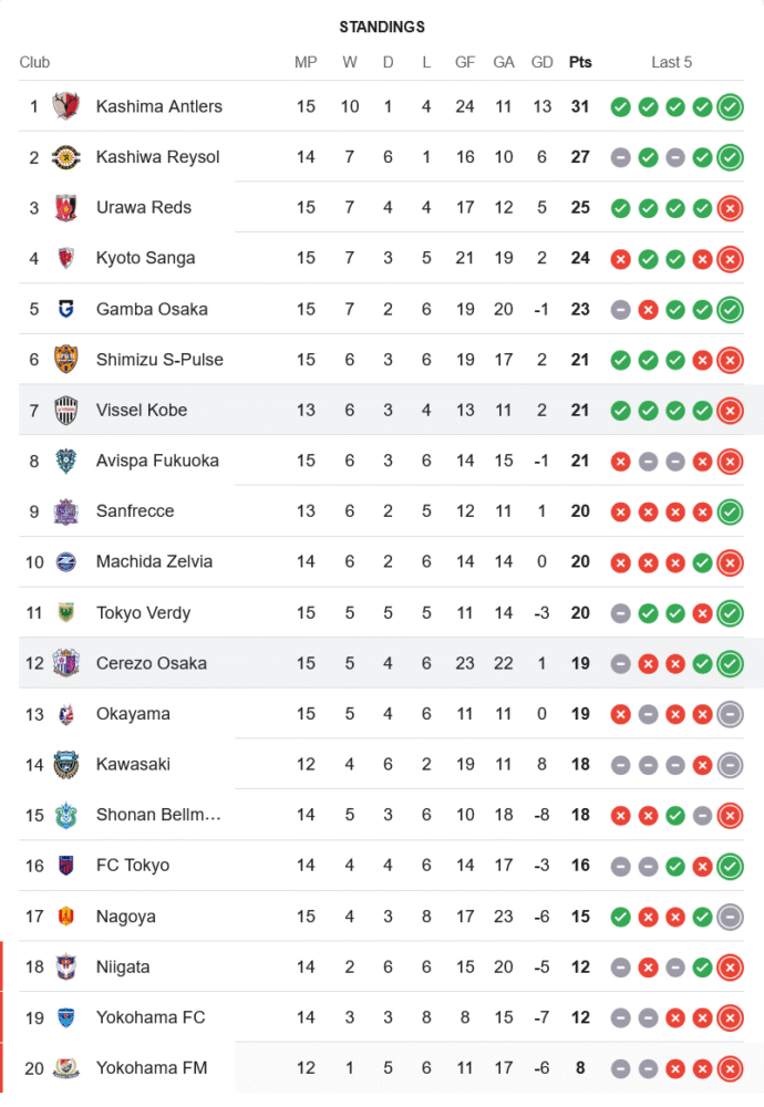 ความพ่ายแพ้ของวิสเซล โกเบทำให้แต้มค้างอยู่ที่ 21 คะแนนจาก 13 นัด หล่นลงมาอยู่ที่อันดับ 7 ขณะที่เซเรโซ โอซาก้าคว้า 3 แต้มสำคัญเพิ่มเป็น 19 คะแนนจาก 15 นัด ขยับขึ้นมาอันดับ 12 ของตาราง ลดช่องว่างจากโซนบนได้สำเร็จ
