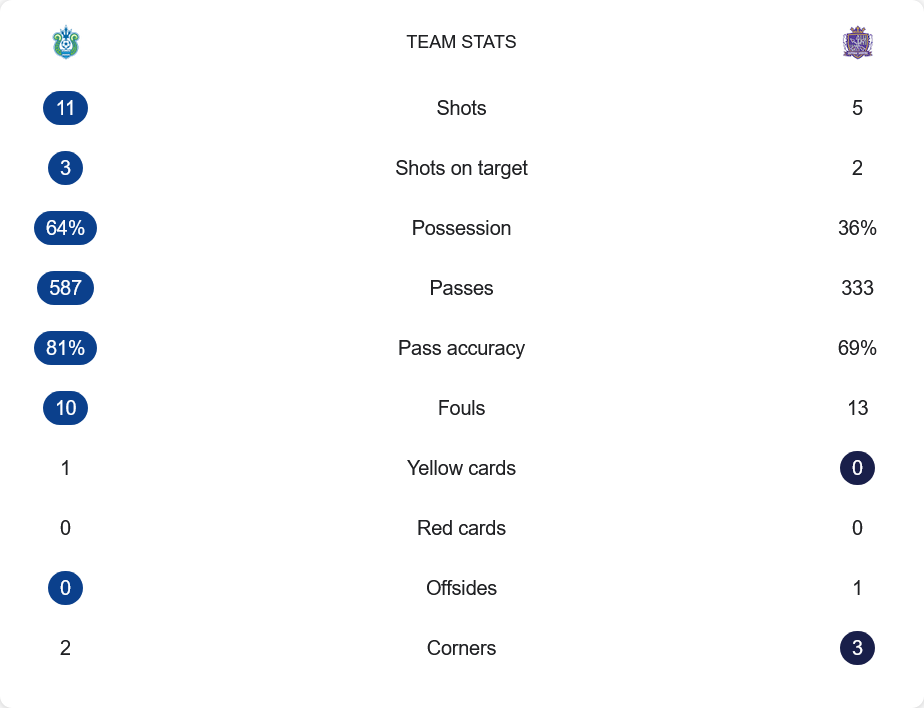 เกมนี้โชนันเป็นฝ่ายครองบอลเหนือกว่าถึง 64% ขณะที่ฮิโรชิมาอยู่ที่ 36% โดยเจ้าบ้านผ่านบอลทั้งหมด 587 ครั้ง และมีความแม่นยำถึง 81% ส่วนทีมเยือนผ่านบอลไป 333 ครั้ง ความแม่นยำ 69% โชนันมีโอกาสยิงรวม 11 ครั้ง เข้ากรอบ 3 ส่วนซานเฟรซเซยิงเพียง 5 ครั้ง เข้ากรอบ 2 และหนึ่งในนั้นคือจุดโทษที่เปลี่ยนเป็นประตู ส่วนจำนวนฟาวล์ทั้งสองทีมสูสีกันที่ 10 ต่อ 13 ใบเหลืองมีเพียงใบเดียวในเกมนี้ที่ตกเป็นของฝั่งโชนัน ขณะที่ลูกเตะมุมฮิโรชิมาได้มากกว่าที่ 3 ต่อ 2