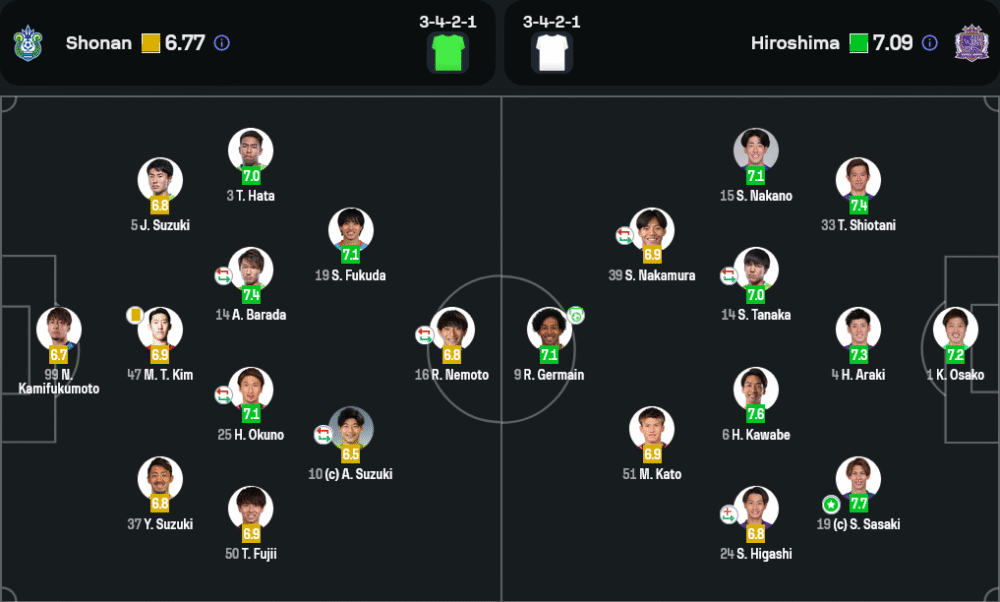 • มิดฟิลด์: ฮายาโอะ คาวาเบะ (7.6), มินาโตะ คาโตะ (6.9), ยูกิ นากาโนะ (7.1), ชุนสึเกะ ฮิกาชิ (6.8)