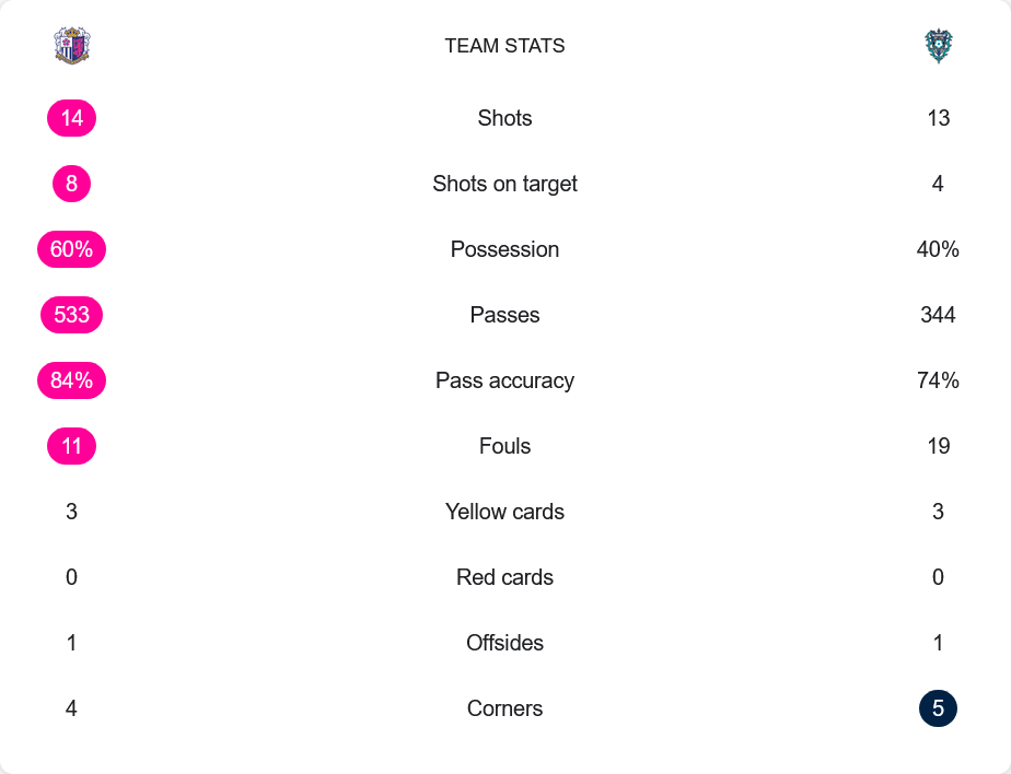 ตลอดทั้งเกม เซเรโซ โอซาก้าเหนือกว่าในด้านการครองบอล ครองเกมไปถึง 60% เทียบกับ 40% ของฟูกูโอกะ โดยเจ้าบ้านผ่านบอลไปถึง 533 ครั้ง และมีความแม่นยำถึง 84% ขณะที่ทีมเยือนผ่านบอล 344 ครั้ง ด้วยความแม่นยำ 74% โอกาสยิง เซเรโซ ยิง 14 ครั้ง เข้ากรอบ 8 ส่วนฟูกูโอกะมี 13 ครั้ง เข้ากรอบเพียง 4 อีกทั้งฟูกูโอกะเสียฟาวล์ถึง 19 ครั้ง ซึ่งมากกว่าเจ้าบ้านที่ทำไป 11 ครั้งเท่านั้น การรับใบเหลืองเท่ากันที่ 3 ใบ ไม่มีใบแดง และมุมเตะฝั่งฟูกูโอกะทำได้มากกว่าเล็กน้อยที่ 5 ต่อ 4