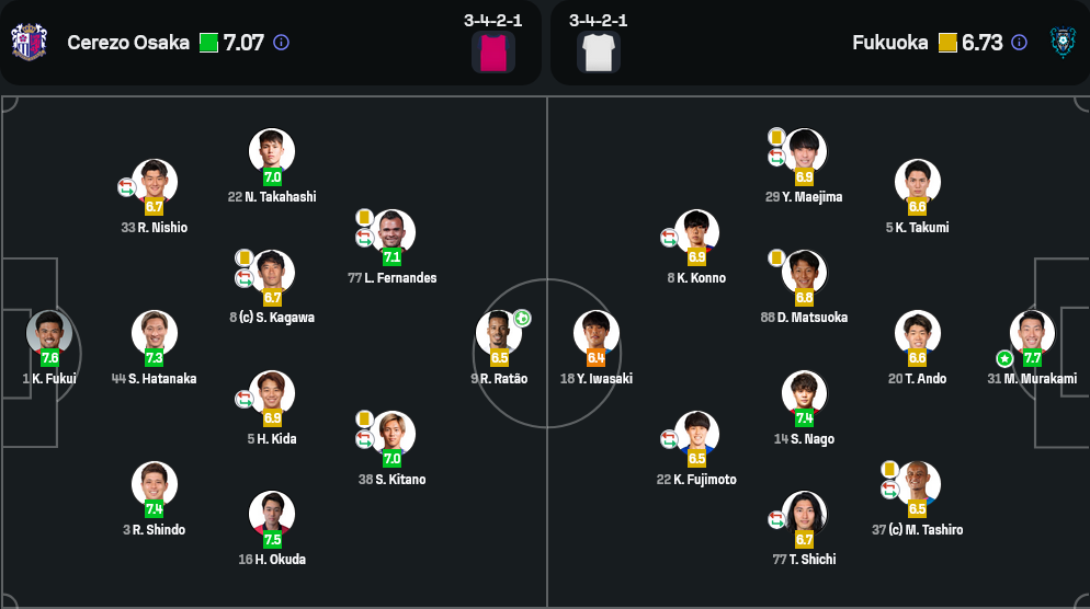 มาซาอากิ มุรากามิ นายทวารของอวิสปา ฟูกูโอกะ แม้ทีมจะแพ้แต่เขาโชว์ฟอร์มเหนียวเซฟได้หลายจังหวะสำคัญ พร้อมได้รับคะแนนสูงสุดในฝั่งทีมเยือนถึง 7.7 คะแนน เป็นจุดสว่างเดียวของฟูกูโอกะในเกมนี้