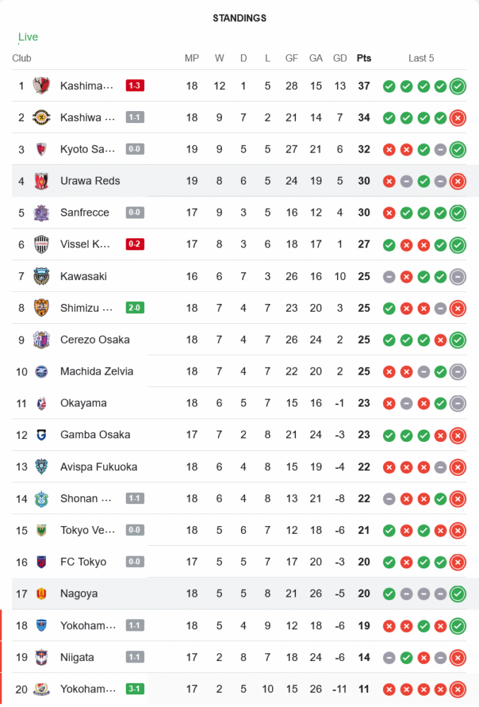 ชัยชนะนัดนี้ของนาโกย่าทำให้พวกเขาขยับขึ้นมารั้งอันดับ 17 ของตาราง มี 20 แต้มจาก 18 นัด ลดความกดดันจากโซนตกชั้นได้เล็กน้อย ขณะที่อูราวะ เรด ไดมอนส์ ที่ก่อนหน้านี้รั้งอันดับ 4 ต้องเสียโอกาสไล่จี้กลุ่มจ่าฝูงอย่างน่าเสียดาย ยังคงมี 30 แต้มจาก 19 นัดเท่าเดิม เสี่ยงโดนทีมอันดับล่างไล่จี้