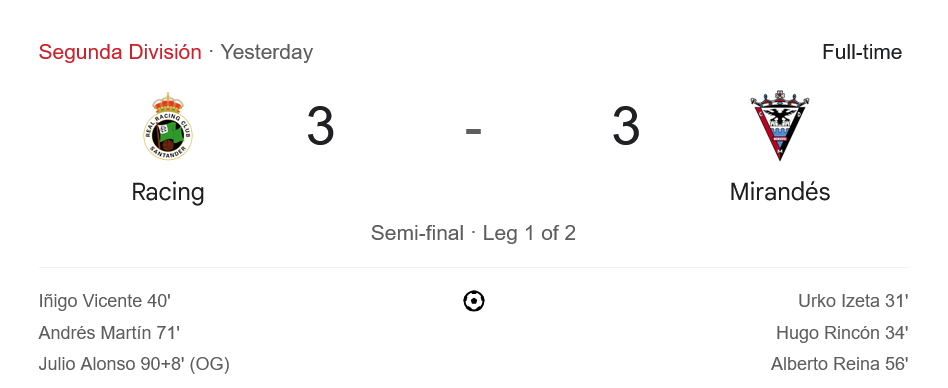 กลับมาในครึ่งหลัง มิรานเดสบุกหนักและมาได้ประตูที่สามจาก Alberto Reina ในนาที 56 เกมดูเหมือนจะขาด แต่ราซิ่งไม่ยอมแพ้ เร่งเกมและตีตื้นกลับมาเป็น 2-3 ในนาที 71 จากจังหวะยิงสุดคมของ Andrés Martín และในช่วงทดเจ็บนาทีสุดท้ายของเกม ความดราม่าก็บังเกิด เมื่อ Julio Alonso ผู้เล่นของมิรานเดสดันทำเข้าประตูตัวเอง ทำให้สกอร์จบลงแบบไม่น่าเชื่อที่ 3-3 เสมอกันสุดมันในเลกแรก ก่อนจะไปตัดสินกันอีกทีในเกมเลกสอง