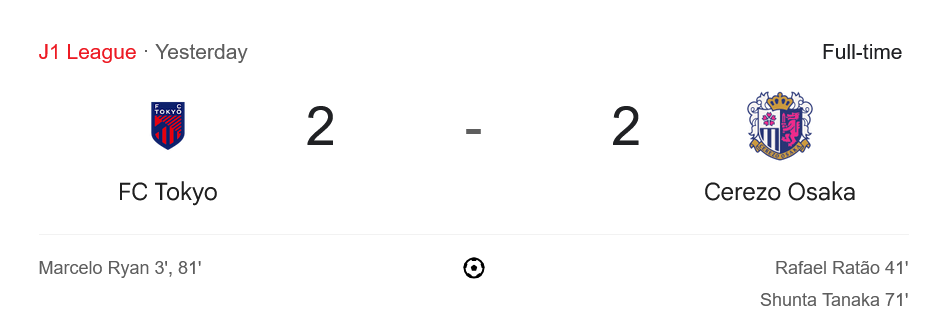 ศึกเจลีก ดิวิชัน 1 เมื่อค่ำวันที่ 14 มิถุนายนที่ผ่านมา เป็นอีกหนึ่งเกมที่แฟนบอลต่างลุ้นกันจนถึงวินาทีสุดท้าย เมื่อ เอฟซี โตเกียว เปิดบ้านต้อนรับการมาเยือนของ เซเรโซ โอซาก้า และผลจบลงด้วยการเสมอกัน 2-2 แบบสุดมัน โดยแมตช์นี้มีทั้งประตูสุดสวย จังหวะพลิกเกม และการโต้กลับที่รวดเร็วให้ผู้ติดตาม ผลบอลสด ทั่วประเทศต้องลุกขึ้นเฮหลายรอบตลอด 90 นาที