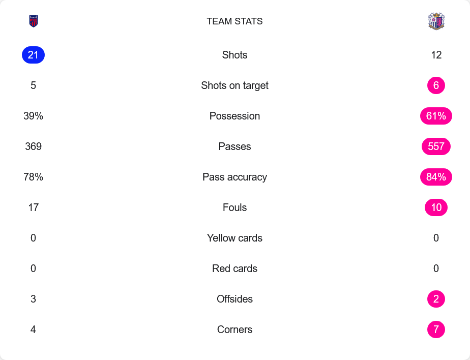เกมนี้ถือเป็นหนึ่งในแมตช์ที่เปิดแลกกันดุเดือด โดยฝั่ง เอฟซี โตเกียว แม้จะครองบอลเพียง 39% แต่มีโอกาสยิงมากถึง 21 ครั้ง แสดงให้เห็นถึงความพยายามและการบุกต่อเนื่อง แต่ตรงกรอบเพียง 5 ครั้ง เซเรโซ โอซาก้า มีจังหวะยิงน้อยกว่าเพียง 12 ครั้ง แต่ตรงกรอบมากถึง 6 ครั้ง และแปรเปลี่ยนเป็นสองประตูเต็มประสิทธิภาพ พวกเขาจ่ายบอลมากถึง 557 ครั้งด้วยความแม่นยำ 84% เทียบกับเจ้าบ้านที่จ่ายบอล 369 ครั้ง ความแตกต่างเชิงคุณภาพของเกมอยู่ที่การจบสกอร์และความแน่นอนในพื้นที่สุดท้าย ฟาวล์รวมกัน 27 ครั้ง ไม่มีใบเหลืองและใบแดง ทำให้เกมดำเนินไปอย่างไหลลื่นตลอด