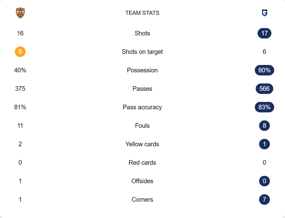เกมนี้กัมบะ โอซาก้าเป็นฝ่ายครองบอลมากถึง 60% ต่อ 40% ของชิมิสุ สะท้อนให้เห็นถึงการควบคุมเกมที่เหนือกว่า มีจำนวนผ่านบอลสูงถึง 566 ครั้ง และแม่นยำถึง 83% เทียบกับชิมิสุที่ผ่านบอล 375 ครั้ง ความแม่นยำ 81% ด้านโอกาสยิง กัมบะยิงรวม 17 ครั้ง เข้ากรอบ 6 ส่วนชิมิสุยิง 16 ครั้ง เข้ากรอบ 8 ฟาวล์ของชิมิสุมากกว่าเล็กน้อยที่ 11 ครั้งเทียบกับกัมบะ 8 ครั้ง มีใบเหลืองรวมกัน 3 ใบ ส่วนลูกเตะมุม กัมบะได้ไปถึง 7 ครั้ง ขณะที่ชิมิสุได้เพียง 1 ครั้งเท่านั้น