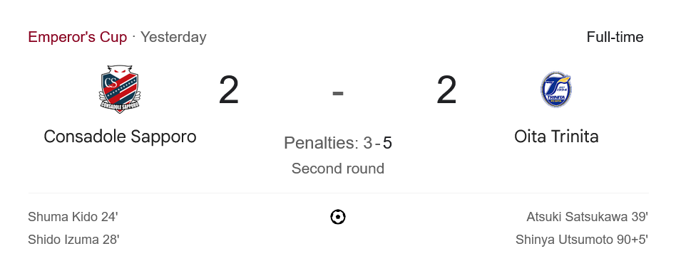 บ้านผลบอล สรุปหลังเกม ศึกเดือดเอ็มเพอเรอร์คัพ! โออิตะ ตรินิต้า ดวลเป้าโค่น คอนซาโดล ซัปโปโร เข้ารอบแบบระทึกใจ 5-3 หลังเสมอในเวลา 2-2