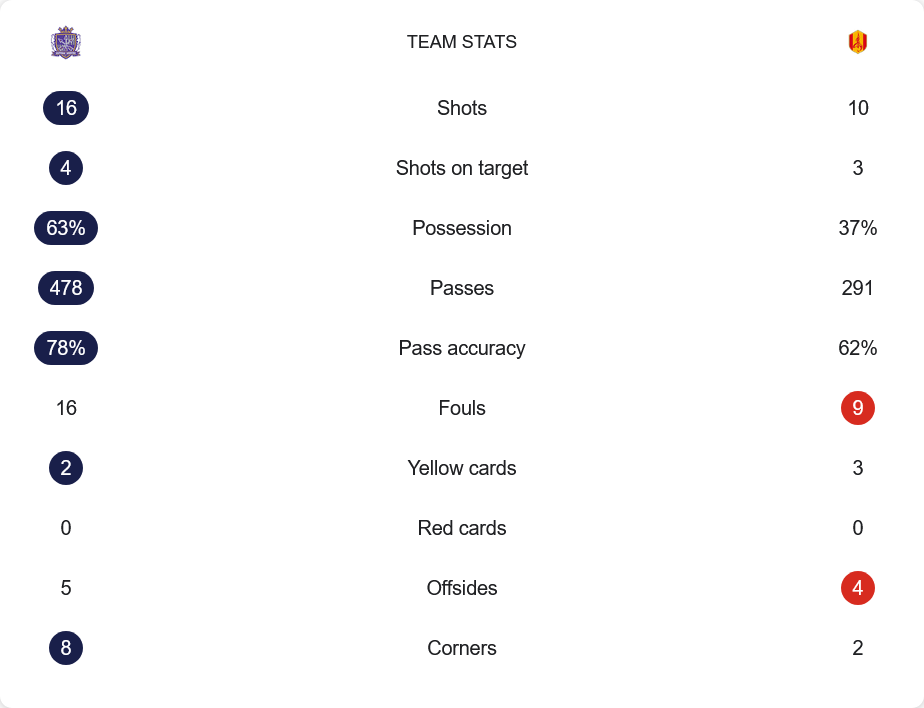 ฮิโรชิม่าครองเกมมากกว่าด้วยเปอร์เซ็นต์การครองบอลสูงถึง 63% เทียบกับ 37% ของนาโกย่า และผ่านบอลมากถึง 478 ครั้ง มีความแม่นยำ 78% ขณะที่นาโกย่าผ่านบอลเพียง 291 ครั้งแม่นยำเพียง 62% อย่างไรก็ตาม ฮิโรชิม่ายิงเข้ากรอบเพียง 4 จาก 16 ครั้ง ขณะที่นาโกย่าแม้จะยิงแค่ 10 ครั้ง แต่เข้ากรอบถึง 3 และเปลี่ยนเป็น 2 ประตู ถือว่าเฉียบคมสุดๆ ส่วนลูกเตะมุมฮิโรชิม่าได้ 8 ครั้ง แต่นาโกย่าได้เพียง 2 แสดงให้เห็นถึงแนวทางที่ต่างกันในการเข้าทำ