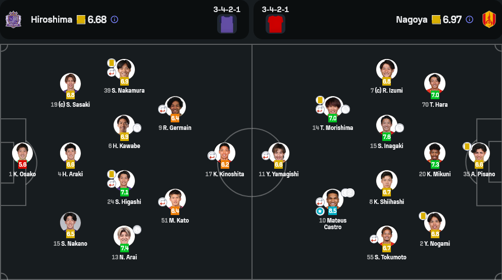 ในทางกลับกัน นาโกย่าของ ฮาเซกาวะ เคนตะ วางหมาก 3-4-2-1 เหมือนกันแต่ใช้การตั้งรับแน่นแล้วโต้กลับรวดเร็ว โดยเฉพาะการใช้ มาเตอุส คาสโตร เป็นแกนกลางในเกมรุก ซึ่งตอบแทนด้วย 2 ประตูเต็มๆ แนวรับของนาโกย่าปิดพื้นที่ได้ยอดเยี่ยม มีวินัย และไม่เปิดโอกาสให้คู่แข่งได้เล่นสบายใจ
