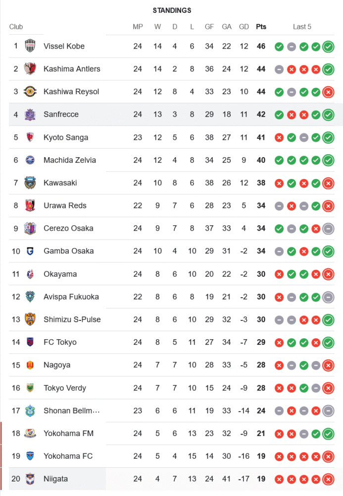 หลังเกมนี้ ซานเฟรซเซ ฮิโรชิม่า ขยับขึ้นไปมี 42 แต้ม รั้งอันดับ 4 จี้หัวตารางอย่างต่อเนื่อง ส่วนอัลบิเร็กซ์ นิงาตะยังคงจมบ๊วยอันดับ 20 มีเพียง 19 แต้มเท่าเดิม สถานการณ์หนีตกชั้นยากขึ้นทุกที