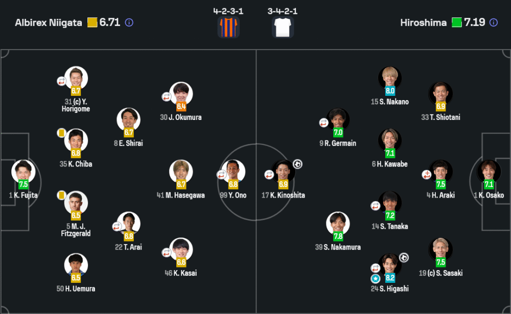 ชุนกิ ฮิกาชิ ของซานเฟรซเซ ฮิโรชิม่า คว้ารางวัลผู้เล่นยอดเยี่ยมไปครองด้วยคะแนนสูงถึง 8.2 ผลงานเกมนี้นอกจากประตูเปิดหัวแล้วยังปั่นป่วนแนวรับนิงาตะทั้งเกม
