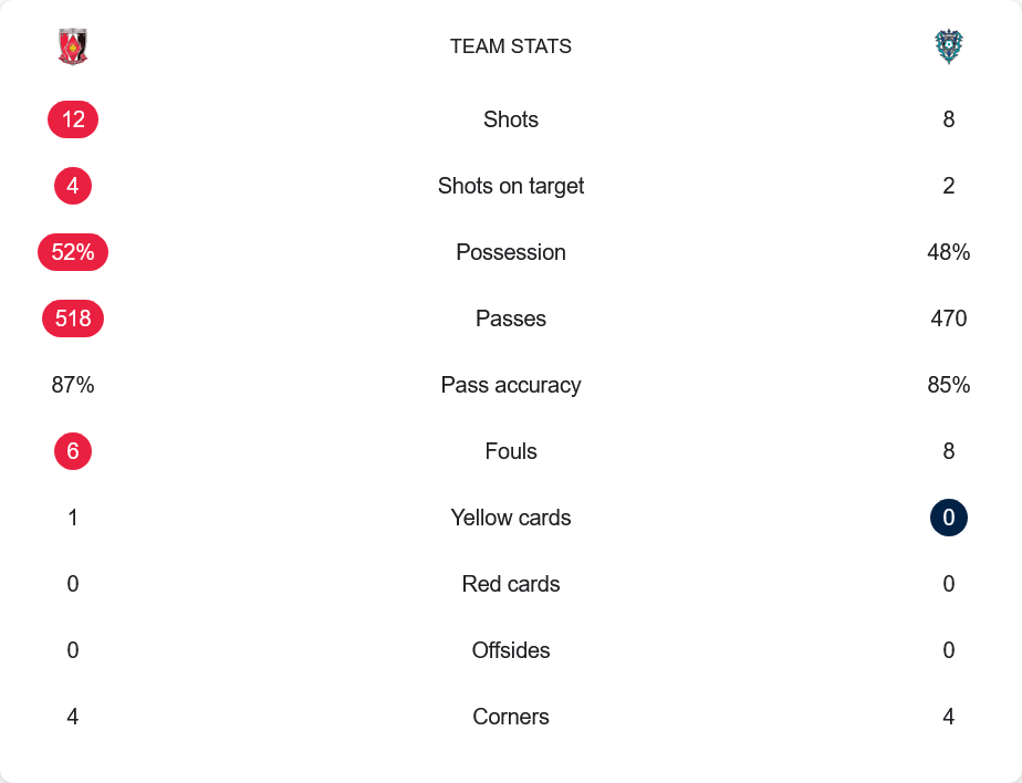 แม้อูราวะจะครองบอลมากกว่าที่ 52% และผ่านบอลได้มากถึง 518 ครั้ง เทียบกับอวิสปาที่มี 48% กับ 470 ครั้ง แต่ประสิทธิภาพในพื้นที่สุดท้ายยังเป็นปัญหา เห็นได้ชัดจากการยิงทั้งหมด 12 ครั้งของเจ้าถิ่นแต่เข้ากรอบแค่ 4 ครั้ง ขณะที่ทีมเยือนยิงเพียง 8 ครั้ง เข้ากรอบ 2 ทั้งสองทีมมีเปอร์เซ็นต์การจ่ายบอลแม่นยำใกล้เคียงกัน (87% ต่อ 85%) ด้านเกมรับ อวิสปาทำฟาวล์มากกว่า (8 ต่อ 6) แต่ไร้ใบเหลือง ส่วนอูราวะโดนใบเหลือง 1 ใบจาก อิชิฮาระ ทั้งสองทีมได้เตะมุมเท่ากันที่ 4 ครั้ง ไม่มีการล้ำหน้า และไม่มีใบแดงเกิดขึ้น