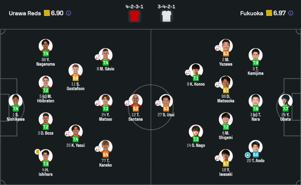 เกมนี้ อูราวะใช้แผน 4-2-3-1 ที่เน้นการครองบอลและบุกจากริมเส้น โดยมี นางานุมะ และ ซาวิโอ เป็นคีย์หลักในการทะลุทะลวงแนวรับฝั่งขวา ส่วนกองหน้าอย่าง ซานตาน่า พยายามเคลื่อนที่หาช่องแต่ยังขาดจังหวะจบที่เฉียบคม ขณะที่แผงกลางอย่าง มัตสึโอะ ทำหน้าที่ปั้นเกมได้ดีแต่ขาดความหลากหลายในจังหวะสุดท้าย