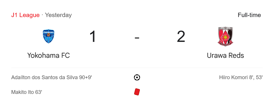 บ้านกีฬาเก็บบรรยากาศ ผลบอลสด เจลีก ดิวิชัน 1 เมื่อวานนี้ โยโกฮามา เอฟซี เปิดบ้านต้อนรับ อูราวะ เรด ไดมอนส์ เกมนี้เต็มไปด้วยจังหวะดราม่า ทั้งการยิงประตู การโดนใบแดง และการบุกดาหน้าไม่ยั้งจากทีมเยือน จบเกม “ปีศาจแดงแห่งไซตามะ” เฉือนชนะ 2-1 จากสองประตูของ ฮีโร่ คอมโมริ ส่วนเจ้าถิ่นได้ประตูปลอบใจจาก อดาอิลตอน ทดเจ็บนาที 90+9