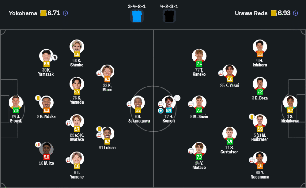 รูปแบบการเล่นของโยโกฮามา เอฟซี วางระบบ 3-4-2-1 เน้นตั้งรับลึกและใช้สองตัวรุกหลังหน้าเป้าอย่างลูเคียนและซากุรางาวะคอยเชื่อมเกมสวนกลับ แต่ความแม่นยำในการผ่านบอลต่ำเพียง 67% ทำให้เสียการครองบอลง่ายและถูกกดดันต่อเนื่อง เกมรับพยายามยืนบล็อกโซนกลางลึก แต่เมื่อเหลือผู้เล่น 10 คนช่วงครึ่งหลัง ยิ่งถูกอูราวะบุกซ้ำหนัก