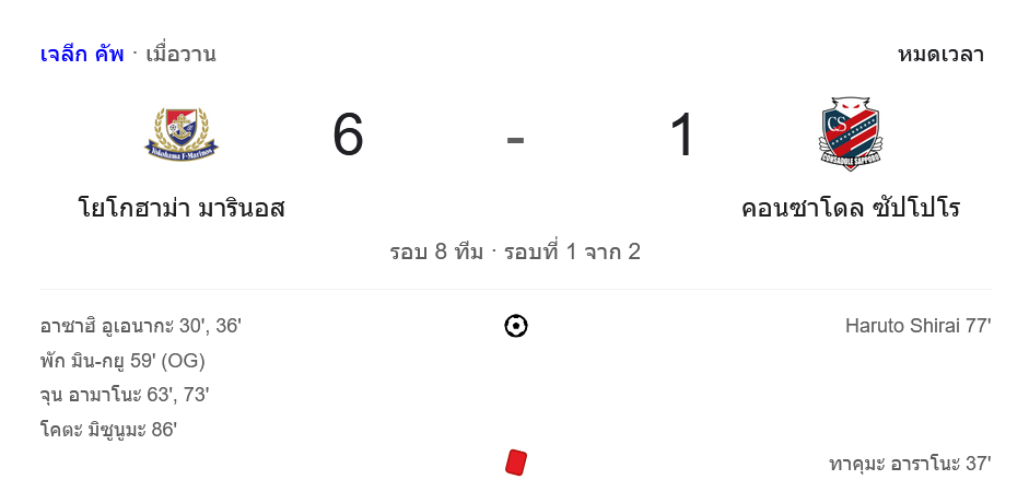 การแข่งขัน เจลีก คัพ 2024 ระหว่าง โยโกฮาม่า เอฟ มารินอส กับ คอนซาโดล ซัปโปโร จบลงด้วยผลสกอร์ 6-1 โดยฝ่ายเจ้าบ้านอย่างโยโกฮาม่า เอฟ มารินอสเป็นฝ่ายคว้าชัยชนะได้อย่างดุดัน และเข้มข้นตามคาดการณ์ แถมยังส่งผลให้ทีมเยือนอย่างคอนซาโดล ซัปโปโร ต้องพบกับความพ่ายแพ้แบบขาดลอย