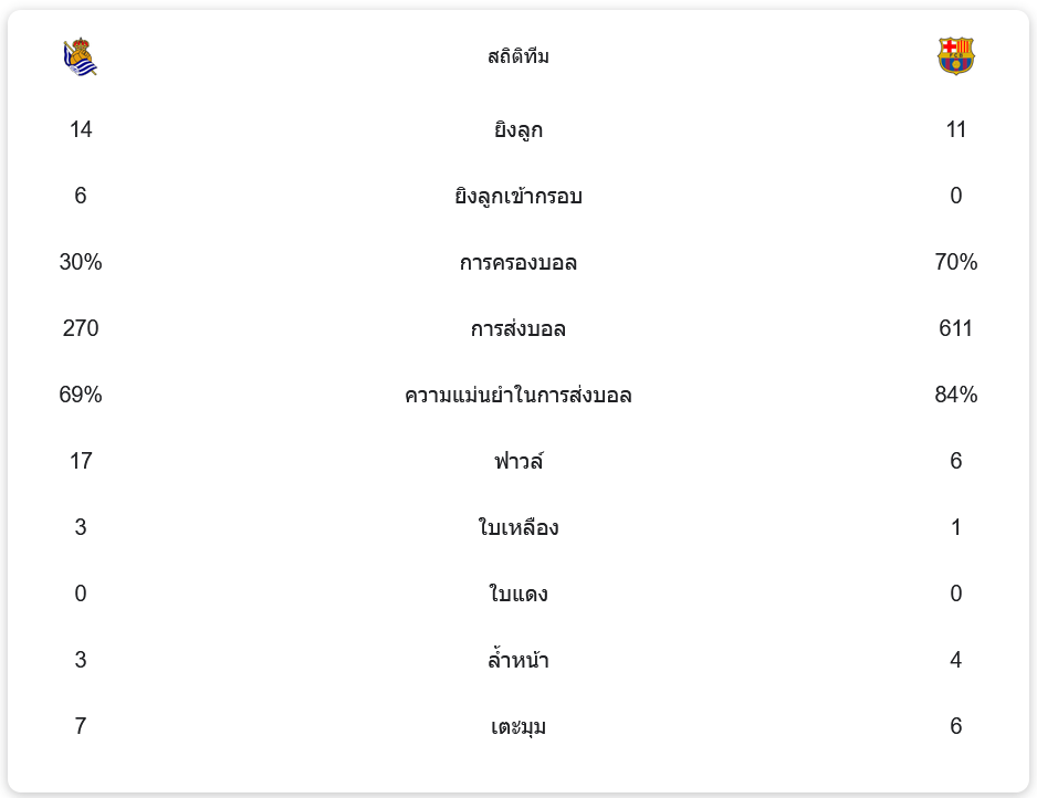 ในเกมนี้ บาร์เซโลน่า ครองบอลมากถึง 70% มีการส่งบอลทั้งหมด 611 ครั้ง แต่กลับยิงเข้ากรอบไม่ได้เลย ในทางกลับกัน เรอัล โซเซียดาด แม้จะครองบอลเพียง 30% แต่ยิงเข้ากรอบถึง 6 ครั้ง สะท้อนถึงความแม่นยำและการใช้โอกาสได้อย่างคุ้มค่า
