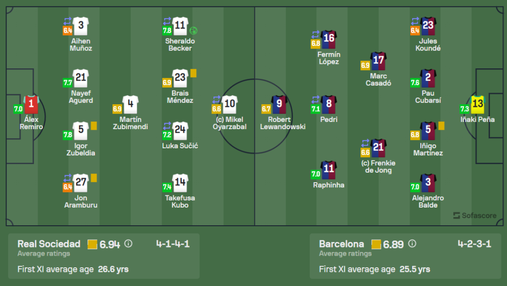เรอัล โซเซียดาด มาในแผน 4-1-4-1 เน้นการตั้งรับอย่างมีระเบียบและโต้กลับเร็ว ขณะที่ บาร์เซโลน่า ใช้แผน 4-2-3-1 เน้นการครองบอลและโจมตีผ่านริมเส้น แต่พบกับปัญหาจบสกอร์ที่ไม่แม่นยำ