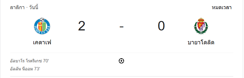 จบเกมการแข่งขัน ลาลีกา สเปน นัดนี้ เกตาเฟ่โชว์ฟอร์มแข็งแกร่งในบ้าน เอาชนะ เรอัล บายาโดลิด ไปด้วยสกอร์ 2-0 จากการทำประตูของ Álvaro Rodríguez และ อัลลัน นียอม ที่ช่วยให้ทีมคว้าสามแต้มสำคัญในลีกนี้ไปได้อย่างยอดเยี่ยม แม้บายาโดลิดจะพยายามบุกและสร้างโอกาสอยู่หลายครั้ง แต่ก็ไม่สามารถผ่านแนวรับของเกตาเฟ่ได้ ทำให้ทีมเยือนต้องกลับบ้านไปมือเปล่า การแข่งขันนี้เป็นอีกหนึ่งแมตช์ที่เต็มไปด้วยความตื่นเต้นและการเล่นที่ดุดันจากทั้งสองทีม บ่งบอกถึงความเข้มข้นของศึกฟุตบอลลาลีกาได้อย่างชัดเจน!