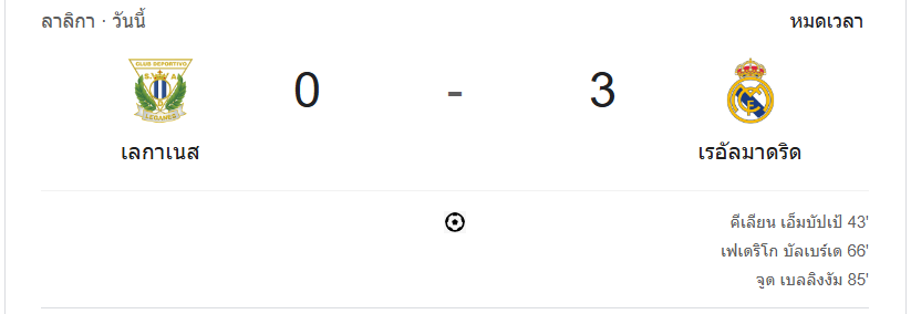 จบเกมการแข่งขัน เรอัล มาดริด โชว์ฟอร์มระดับแชมป์ด้วยการถล่มเลกาเนส 3-0 ในเกมนี้ “ราชันชุดขาว” แสดงให้เห็นถึงความแข็งแกร่งทั้งในแนวรุกและแนวรับ พร้อมเก็บสามแต้มสำคัญกลับบ้านอย่างงดงาม ส่วนทางเลกาเนสต้องกลับไปวางแผนใหม่เพื่อปรับปรุงเกมรับให้ดีกว่านี้ในนัดถัดไป