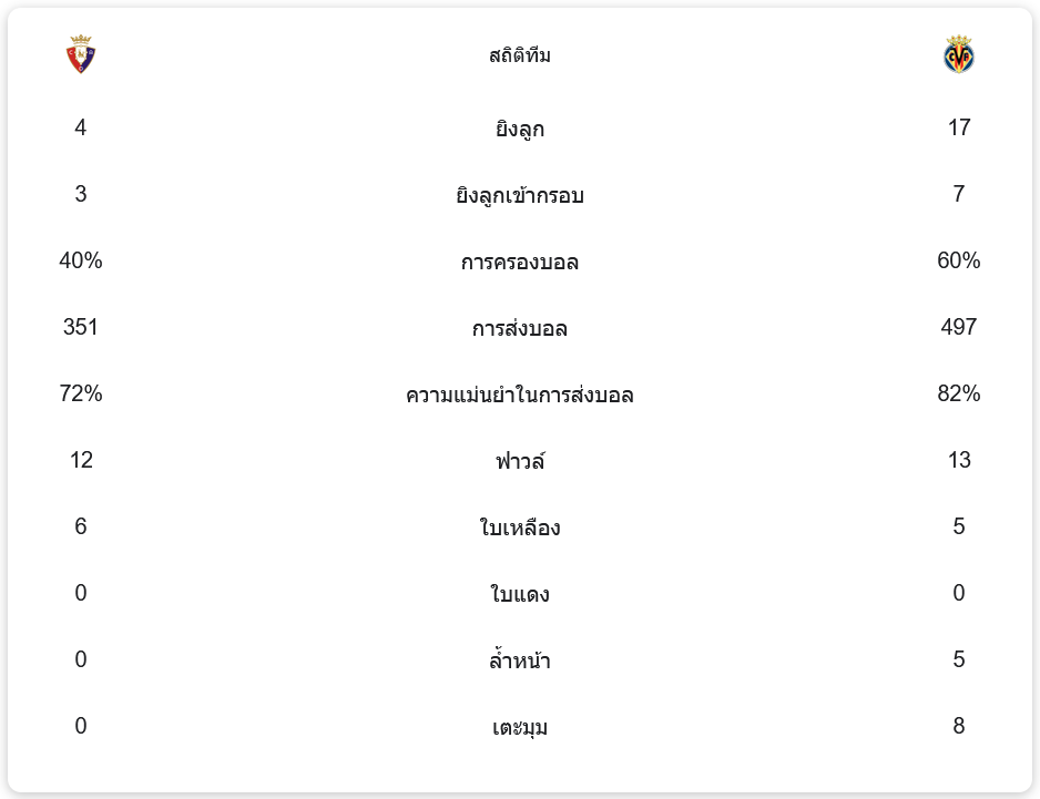 บียาร์เรอัลครองบอลได้มากกว่าที่ 60% และสร้างโอกาสยิงได้ถึง 17 ครั้ง โดยเข้ากรอบ 7 ครั้ง ขณะที่โอซาซูน่ามีโอกาสยิงเพียง 4 ครั้ง เข้ากรอบ 3 ครั้ง แม้จะครองบอลน้อยกว่า แต่เจ้าบ้านอาศัยความแม่นยำในการจบสกอร์สร้างความได้เปรียบในครึ่งแรก