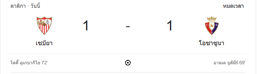 บ้านกีฬา รายงานผลบอลสดค่ำคืนนี้ เซบีย่าเปิดบ้านรับการมาเยือนของโอซาซูน่า และจบเกมด้วยผลเสมอ 1-1 ในเกมที่เต็มไปด้วยการบุกแลกกันอย่างดุเดือด โดยโอซาซูน่าได้ประตูนำก่อนจากอันเต้ บูดิเมียร์ ก่อนที่โดดี้ ลูกีบากิโอ จะยิงตีเสมอให้เจ้าบ้านในช่วงครึ่งหลัง
