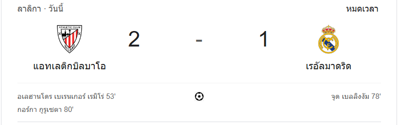 บ้านกีฬา รายงานผลบอลสดจากสนามซาน มาเมส แมตช์ที่เต็มไปด้วยดราม่าและความเข้มข้นระหว่างแอธเลติก บิลเบา และ เรอัล มาดริด โดยเจ้าถิ่นเฉือนชนะไป 2-1 แม้เรอัล มาดริดจะยิงตีเสมอในนาทีที่ 78 แต่บิลเบาก็ไม่ยอมแพ้และทำประตูชัยในนาทีที่ 80
