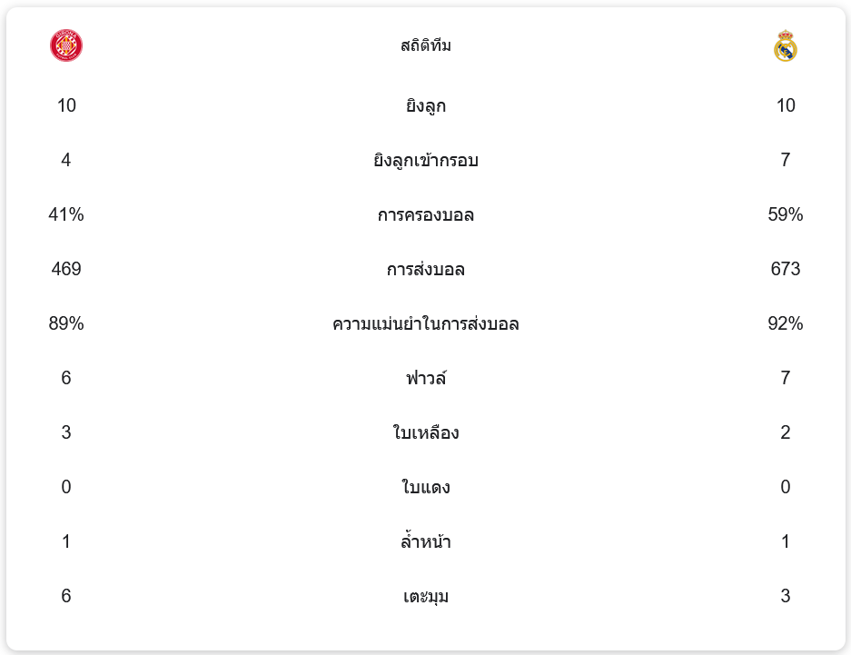ในเกมนี้ เรอัล มาดริด ครองบอลได้ถึง 59% มีโอกาสยิง 10 ครั้ง และยิงเข้ากรอบถึง 7 ครั้ง ความแม่นยำในการส่งบอลของทีมเยือนอยู่ที่ 92% ซึ่งสูงกว่าเจ้าบ้านที่ครองบอลเพียง 41% และยิงเข้ากรอบได้เพียง 4 ครั้ง นอกจากนี้ คิโรน่ายังเสียใบเหลืองถึง 3 ใบ แสดงให้เห็นถึงความกดดันจากเกมรุกของเรอัล มาดริด