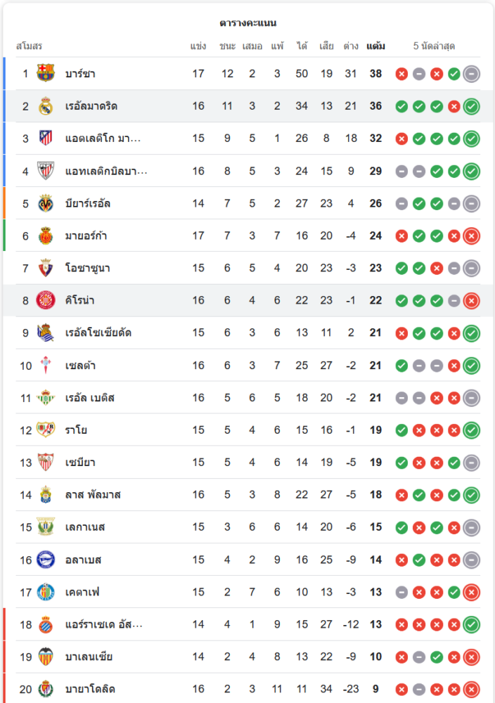 เรอัล มาดริด เก็บเพิ่มเป็น 38 แต้มจาก 16 นัด ไล่ตามจ่าฝูง บาร์เซโลน่า ซึ่งมีแต้มเท่ากันแต่แข่งมากกว่า 1 นัด ขณะที่ คิโรน่า ยังคงรั้งอันดับ 8 ด้วย 22 แต้มจาก 16 นัด